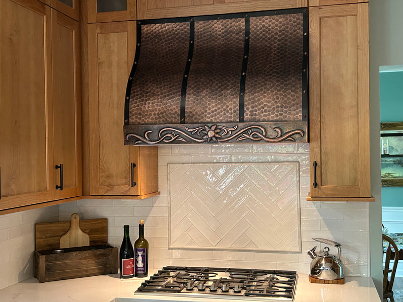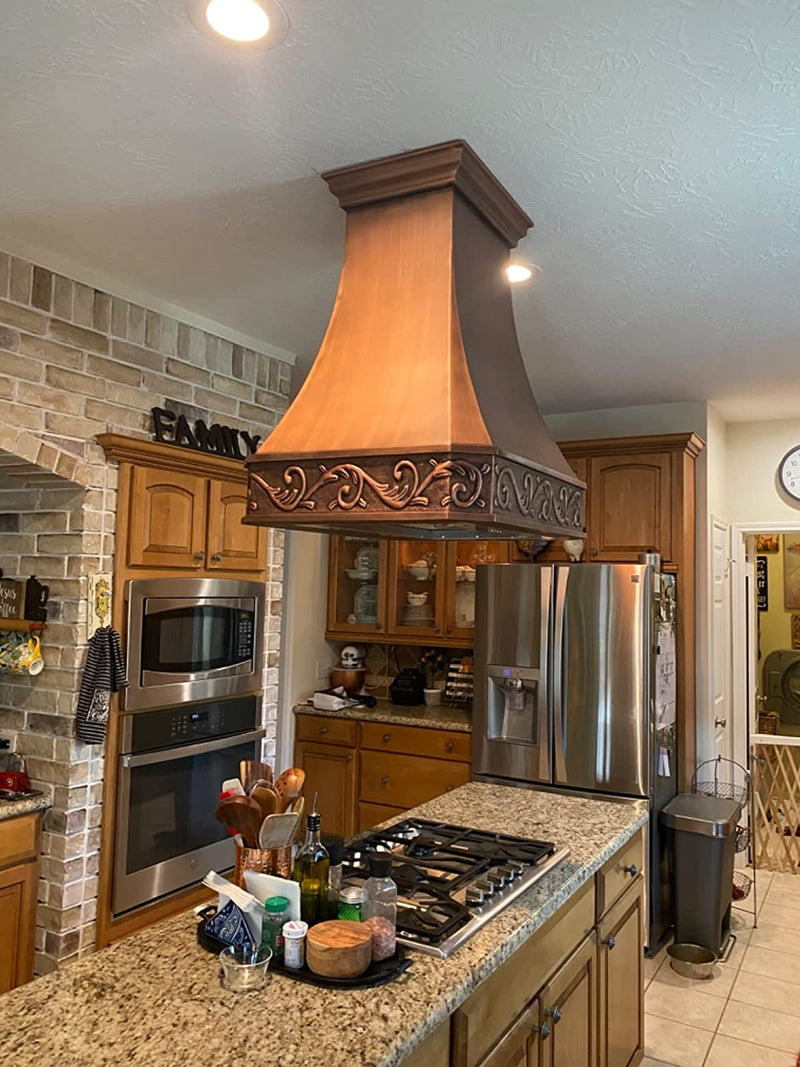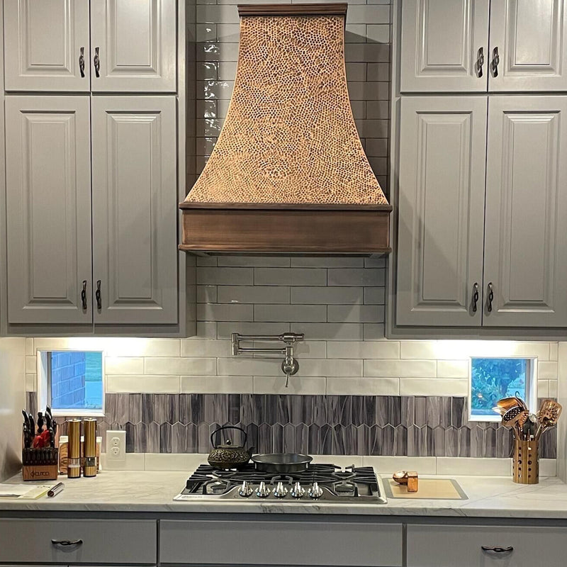 Tailor your copper vent hood to perfectly fit your kitchen's design with fully customizable options in size, shape, finish, and decorative elements.